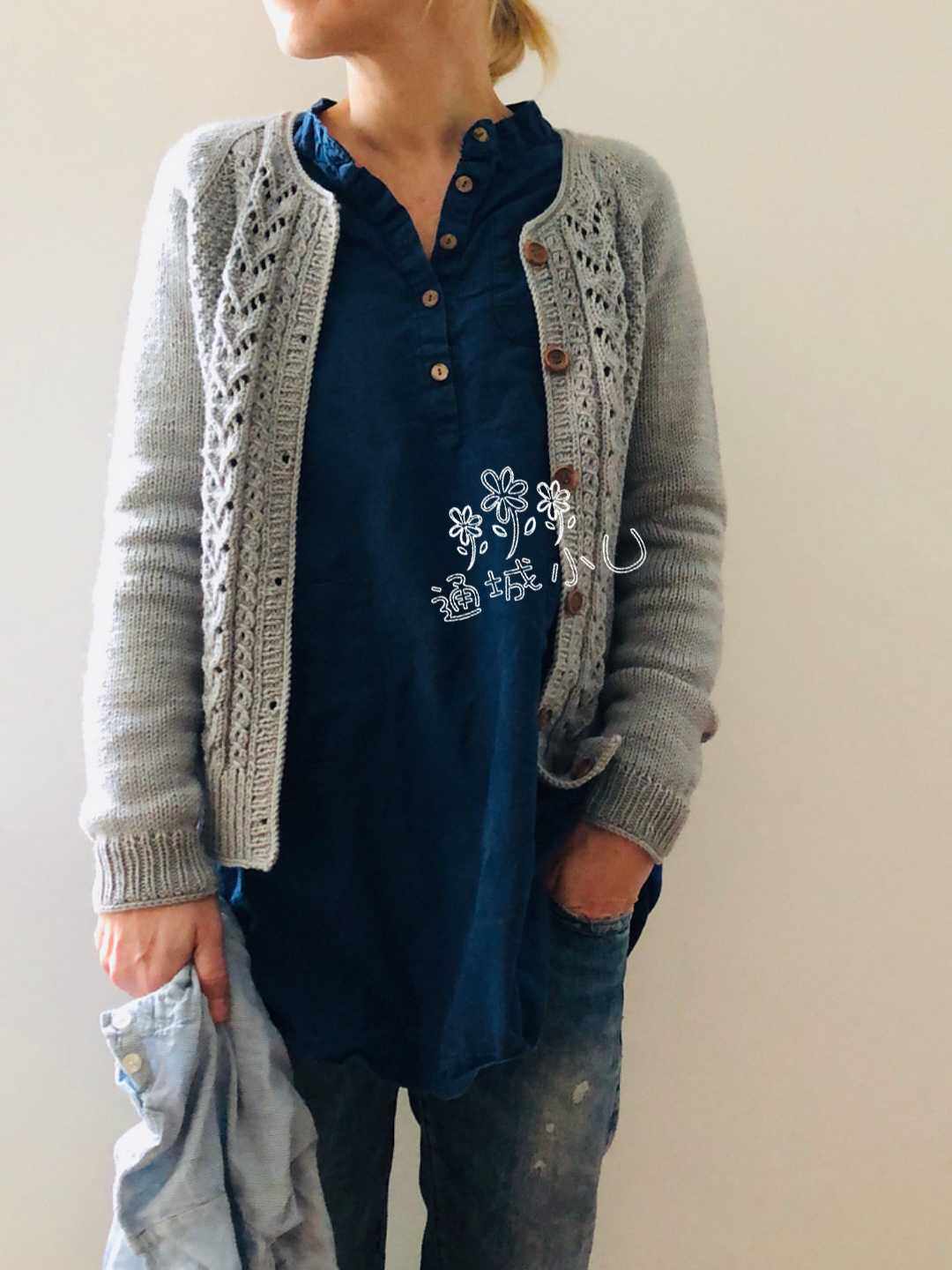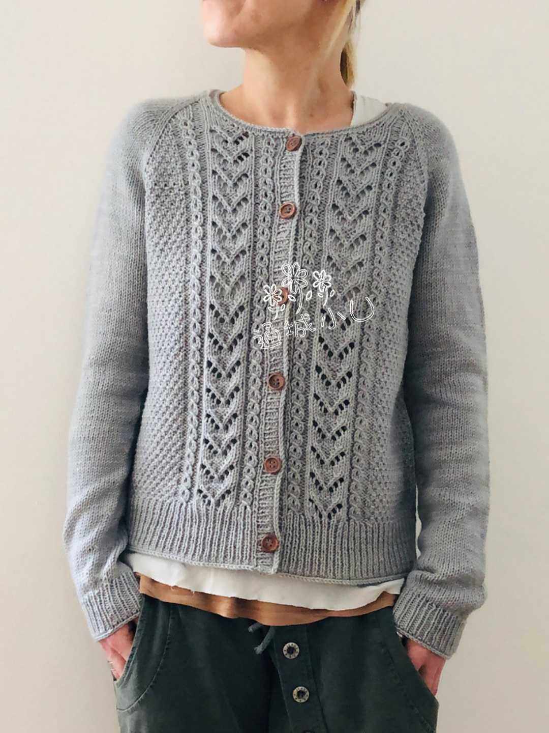 织1圈下针下针方式收针完工 藏好线头,洗净定型,缝纽扣. 上面说了一堆,估计不动手时,看着就头晕了,动手的话,不要想太多了,就照文字织好了。还有,只要起好头,对好花样,可随意织,不用太扣字眼了,上往下,加针都是那样,茎干的二侧各加一针,四个茎干就是加8针。有领子调节的就算上前领加针,就是加10针了。要是想圆些,也可把前领一次一边加二针三针都行的,注意最终的针数,后片前片的针数要相同。 关于线材,自己用啥织啥,对线材的混搭织,目前亮织过的认为最佳配比,就是蕾丝型羊毛配马,有型软滑有光泽,价不高,材料易得。没什么好看与不好看的线,只要选对款,或自己把线调配后,都好看的,关键要成份好,别花什么高价买什么原版不原版,量力而行,量出为入,钱多别论。 当自己看图晕时,看看原版模特样衣,与她人的过程图,也可以豁然开朗哦,告诉你们一个秘密亮有时也看不懂文字,就看模特身上衣。